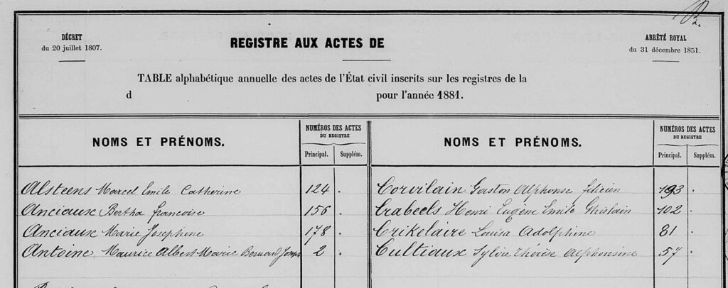 Annual alphabetical table of civil status records entered in the registers of the municipality of Namur for the year 1881